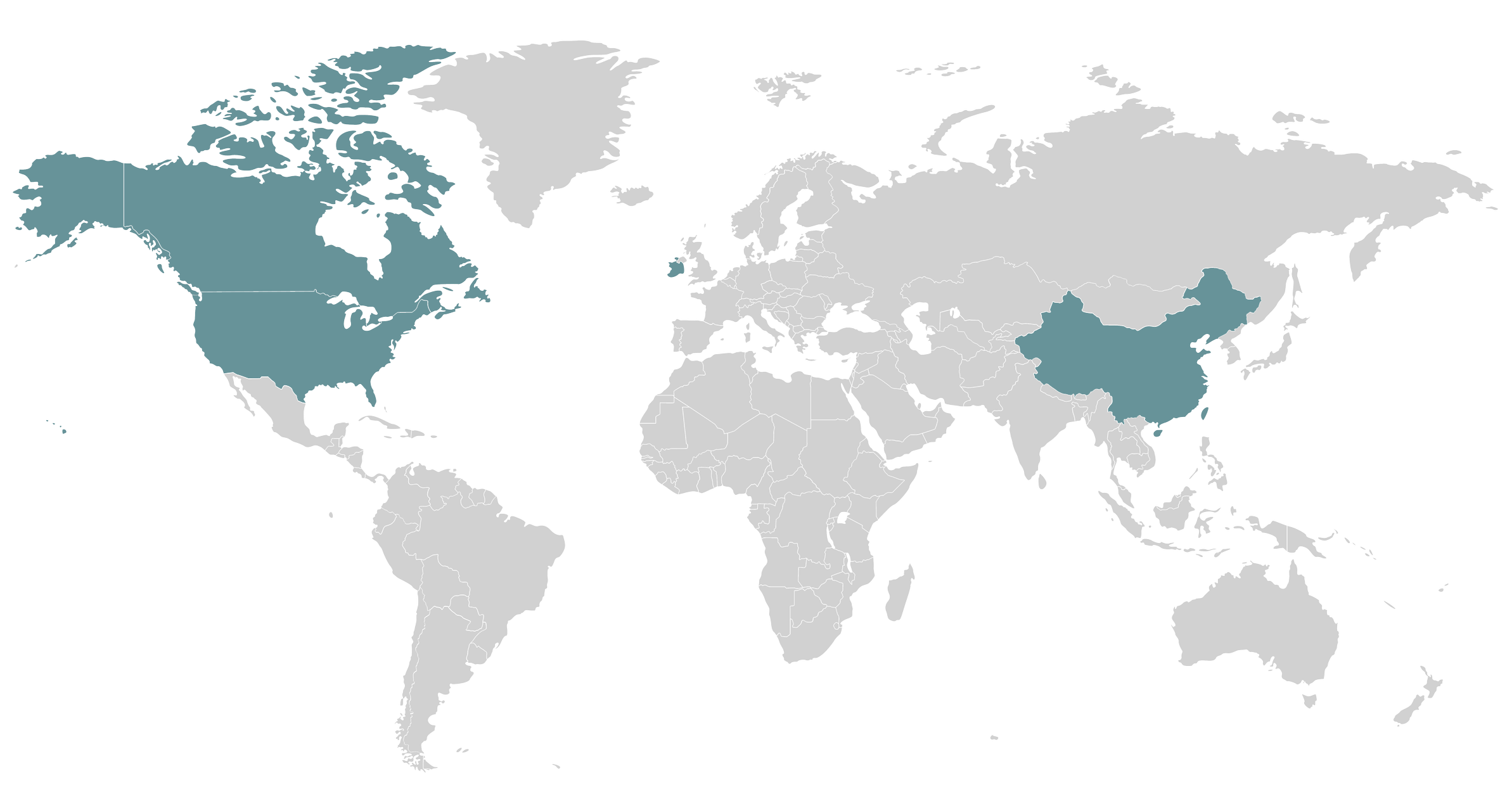 B.C. (Canada), Nevada (USA), Ireland (Europe), Dongguan (China)